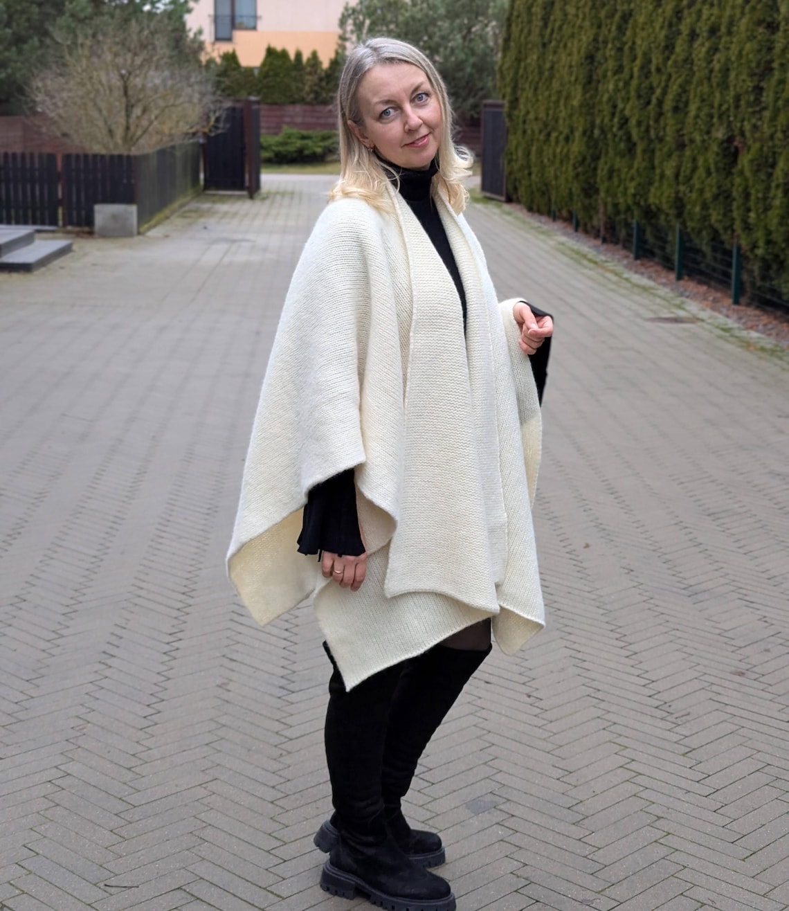 Šiemet rudens pabaigos mėnesį praleidom Italijoje. Vakarais miesteliuose ir restoranų terasose man labai gražiai atrodė ne turistės, t.y. ne striukėmis apsirengusios praeivės, o paltukais ir labai dažnai skraistėmis apsigaubusios, senjoros. Tada toptelėjo, kad reikia traukt iš sandėliuko mezgimo mašiną - gautųsi malonios tekstūros šilta skraistė iš megztos ir suveltos vilnos.